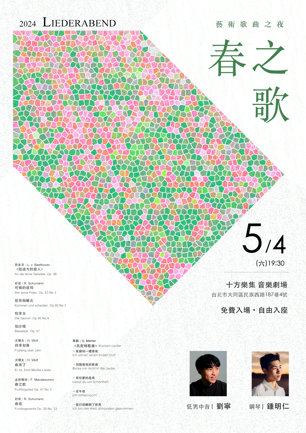 當冬天離去,春日暖陽再次籠罩了大地,詩人們便將春天化為詩歌,作曲家則以音樂賦予這些詩句新生。四首歌曲選自沃爾夫、孟德爾頌、舒曼三位作曲家,他們以細膩且生動的音樂展現了春天之美。